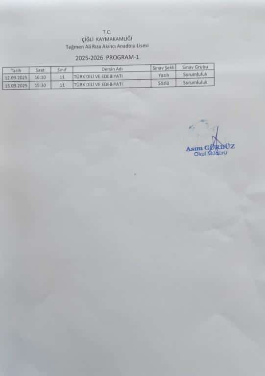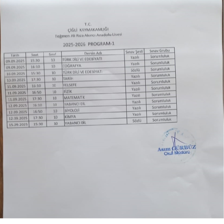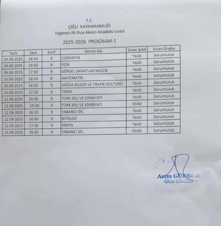 2025-2026 EĞİTİM VE ÖĞRETİM YILI EYLÜL DÖNEMİ SORUMLULUK SINAV TARİHLERİ